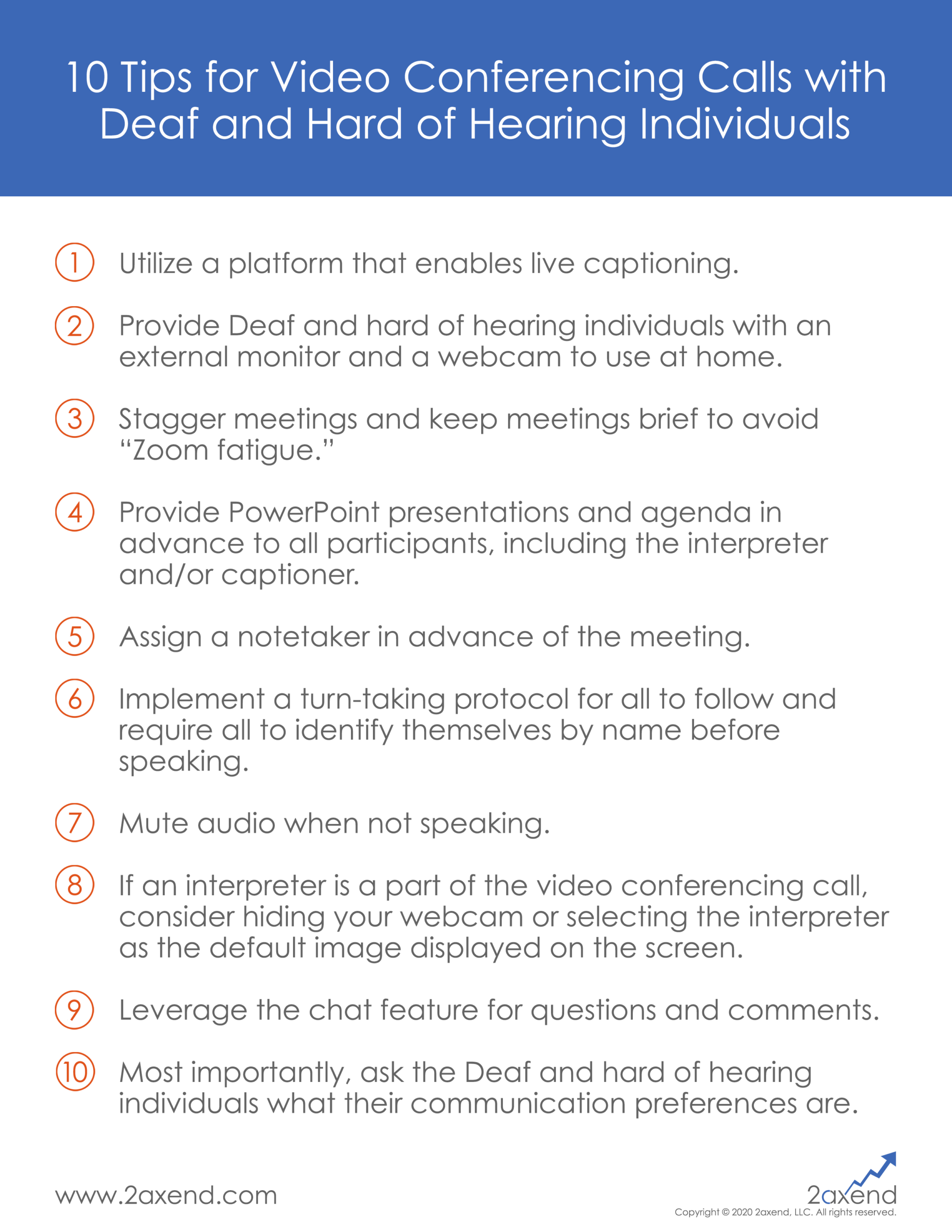 Image Description: Document titled, “10 Tips for Video Conferencing Calls with Deaf and Hard of Hearing Individuals.” The ten tips are as follows: